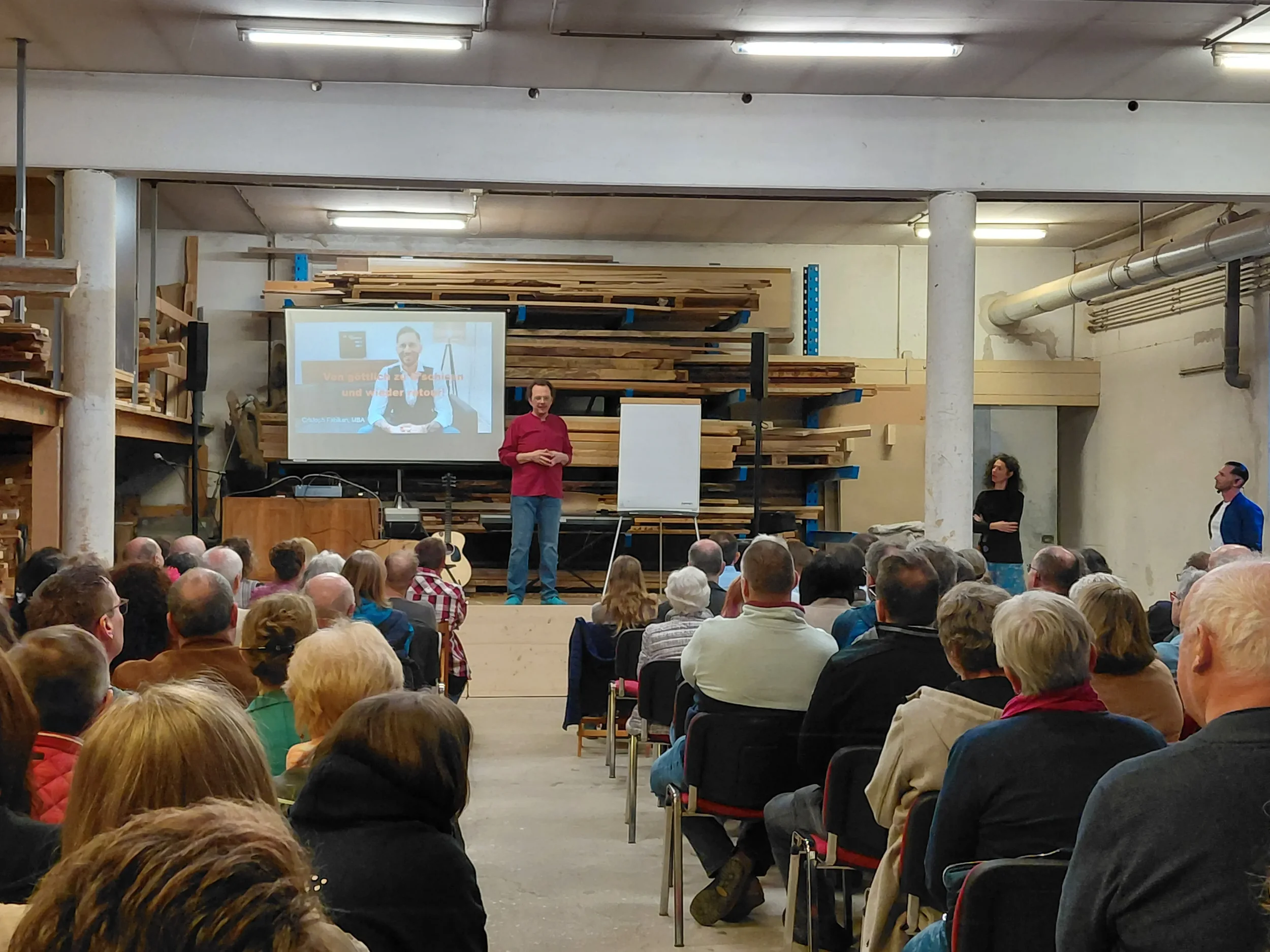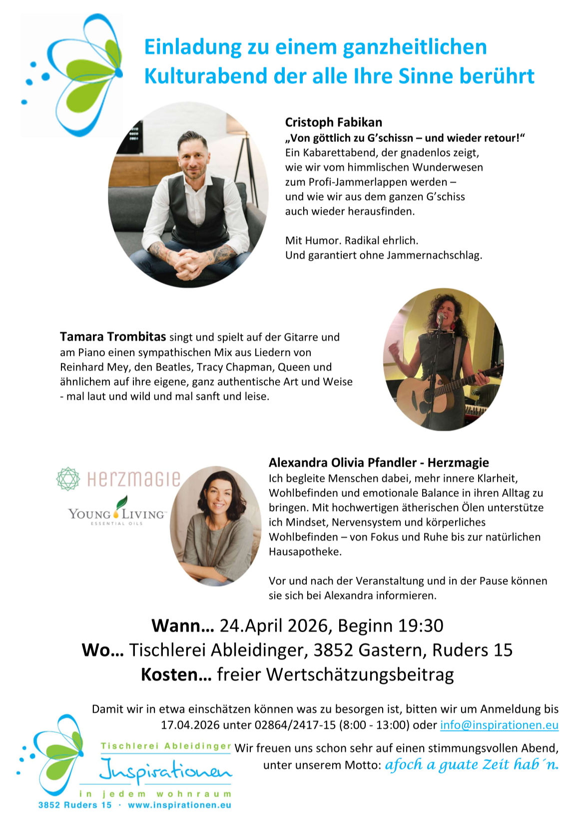Unsere Werkstatt in Gastern wurde am 24. April zum Schauplatz für einen außergewöhnlichen Kulturabend, der alle Sinne berührte. In der besonderen Atmosphäre der Tischlerei Ableidinger durften wir gemeinsam lachen, nachdenken und einfach eine gute Zeit verbringen.